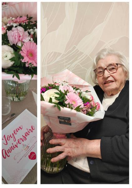 Pour célébrer ce bel événement, un petit-déjeuner gourmand lui a été offert ce matin. Lors du repas de midi, la résidence lui a remis un magnifique bouquet de fleurs (Fleuriste: Art Zen Bouc bel air), elle a soufflé ses bougies, entourée des résidents qui chantaient pour elle, un moment rempli d’émotion.