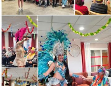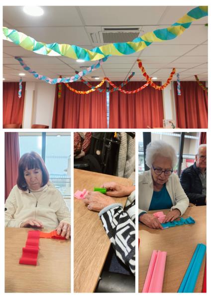 Nous avons récemment organisé un atelier créatif autour du thème du carnaval. À cette occasion, les résidents ont réalisé de jolies guirlandes colorées, notamment grâce au pliage de papier crépon, une activité qui les a beaucoup amusés et qui a apporté une belle touche couleur dans la salle d'animation.