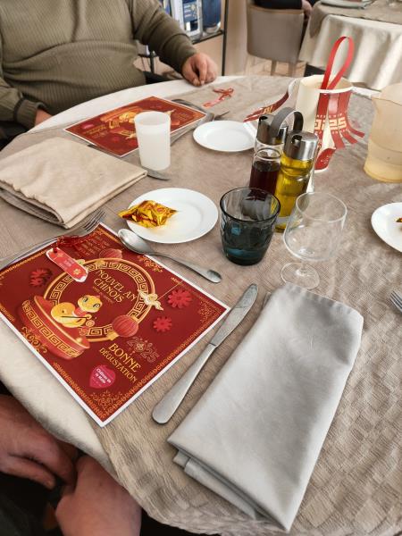 Nous avons célébré le Nouvel An chinois avec un repas thématique exceptionnel lors du déjeuner de mercredi. Les résidents ont eu l'occasion de déguster des nems, du riz cantonais, du porc au caramel, une boisson au litchi et un dessert à la noix de coco.