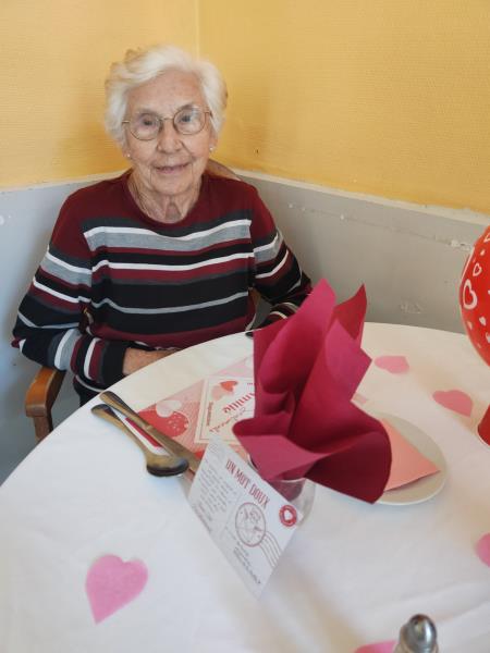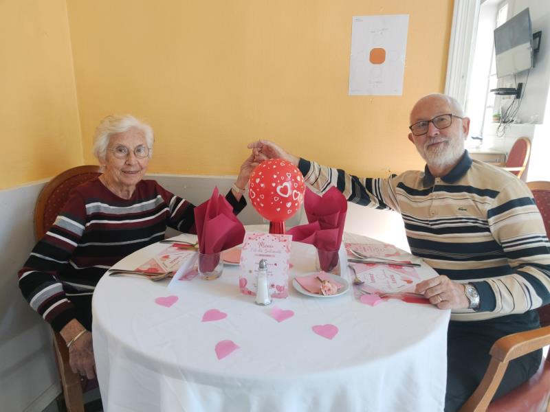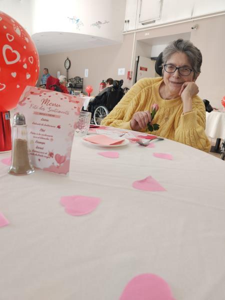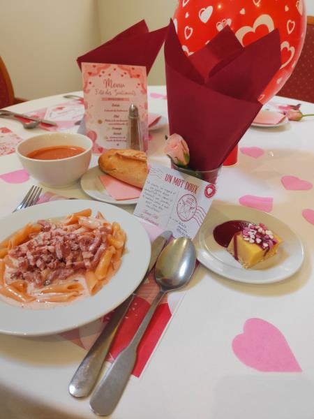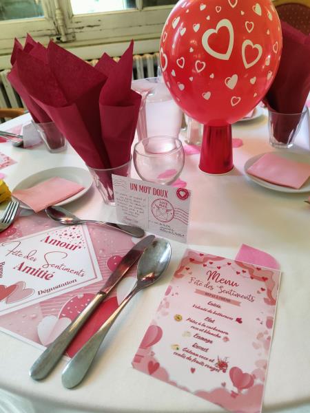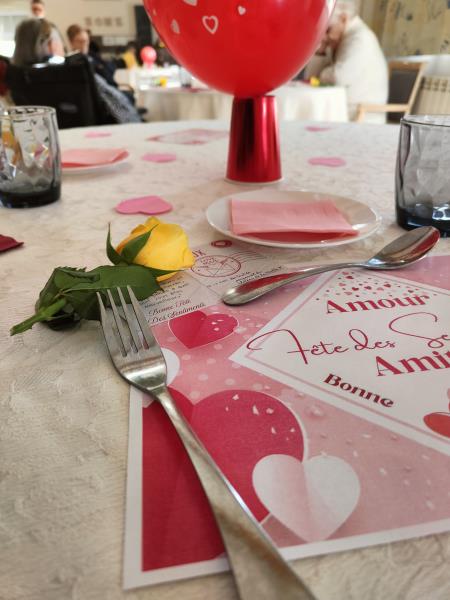 Pour la Fête des Sentiments, nous avons organisé un repas thématique aux couleurs de l'amour. Les tables ont été soigneusement décorées afin de surprendre les résidents lors de ce repas. Chacun a reçu une rose accompagnée d'un doux message.