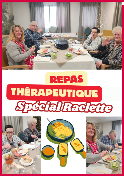 Nous avons mis en place des repas « raclette thérapeutique » chaque jeudi midi, organisés par petits groupes de 4 résidents, réunis selon leurs affinités. Un moment chaleureux et convivial, pensé pour favoriser le plaisir, le partage et le bien-être.